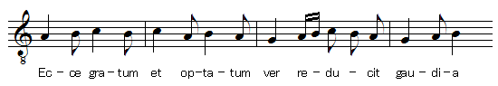 たとえばビンクリー+ミュンヘン古楽スタジオの解釈は、これを次のような旋律として歌っています。reducitのreに付けられているのは、斜線の下に点がつくスカンディスクと読んでいるようですね。