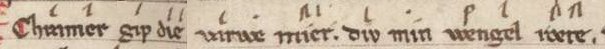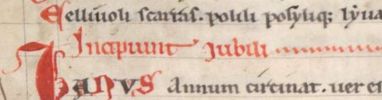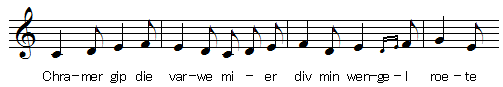 ⁄)や低い(あるいは軽い)プンクトゥム(•)、高い→低いの2音となるクリヴィス(⋀)などで示されます。譜線がないため正確な音高をつかむことはできませんが、これらの音楽を最初に復元演奏したビンクリーによれば、13世紀パリ楽派(ノートル・ダム楽派)の写本に含まれる同じ曲の四角ネウマと校合することで、かなり正確に再現ができたということです[Binkley]。いくつか例を挙げてみます。- S.CCIII/CB.16*. Primitus producatur PilatusのChramer...の部分